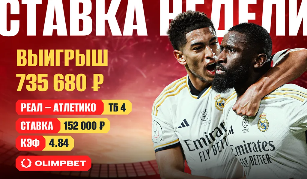 Беттор выбрал для ставки рискованный вариант – 152 тыс. рублей на ставку «тотал больше 4 голов» с коэффициентом 4.84. Уже в первом тайме команды обезопасили ставку клиента OLIMPBET, обменявшись двумя мячами. А на 78-й минуте ставка сыграла – автогол защитника «Королевского клуьа» Антонио Рюдигера принёс клиенту выигрыш в размере 735 860 рублей. Основное время завершилось вничью 3:3, но до пенальти не дошло. «Реал» ещё дважды забил во второй дополнительной 15-минутке.