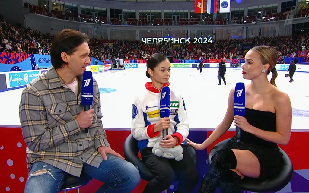 В первой половине дня за двоих отдувался Максим Траньков. Загитова подошла в тот момент, когда её коллега начинал брать интервью у Татьяны и Алексея Мишиных. Чуть позже к микрофону подошёл Евгений Семененко. Максим передал слово Загитовой, и та уделила внимание только Семененко. В итоге Мишины, постояв рядом несколько минут, ушли, оставив Евгения одного.